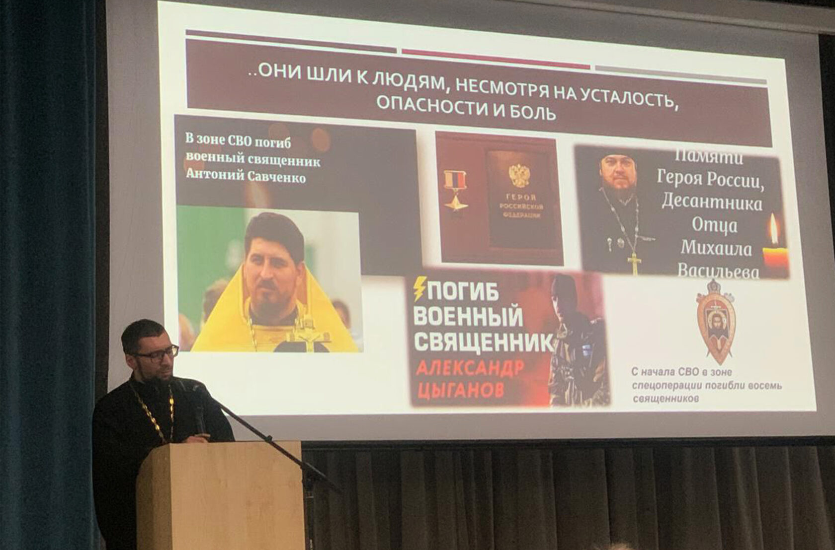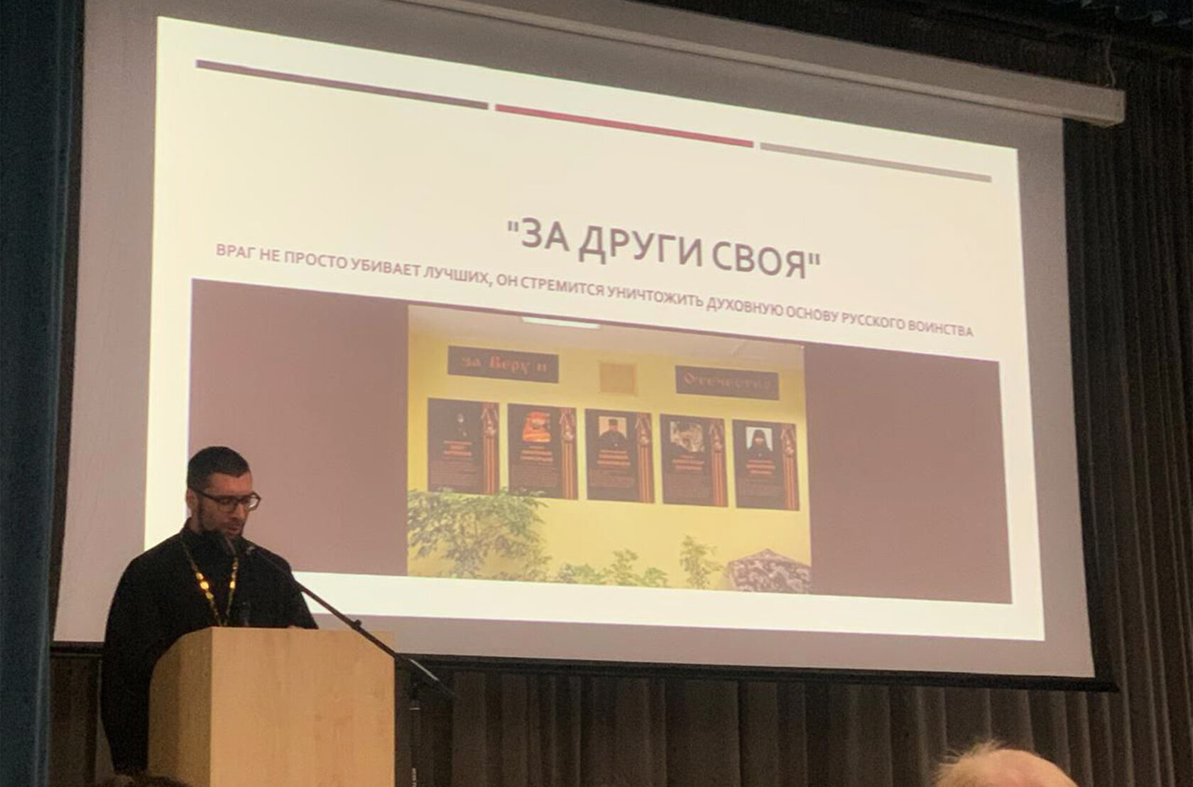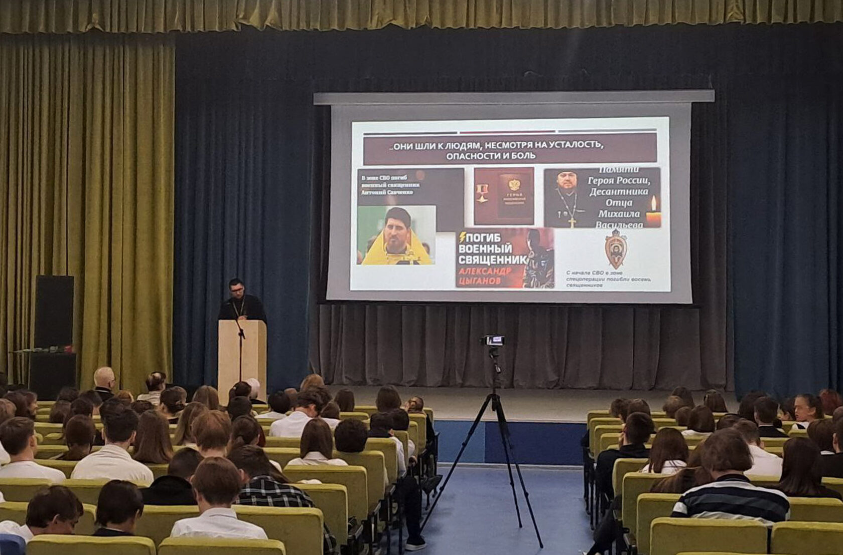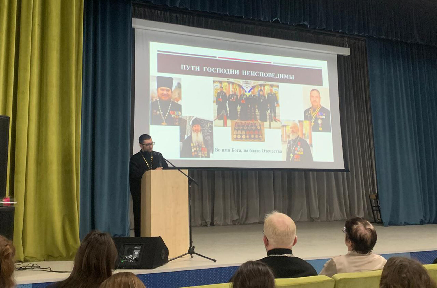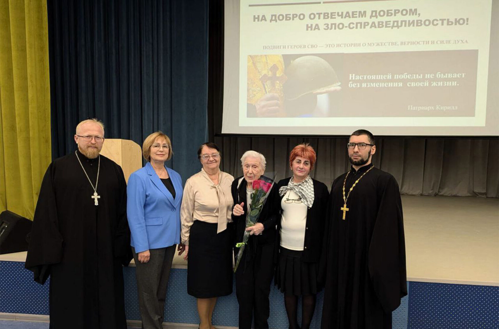 На встречу были приглашены гости из Королёвского благочиния, представители методического центра УМОЦ, а также бабушка выпускника школы, Героя России Александра Баровского, погибшего в ходе специальной военной операции.