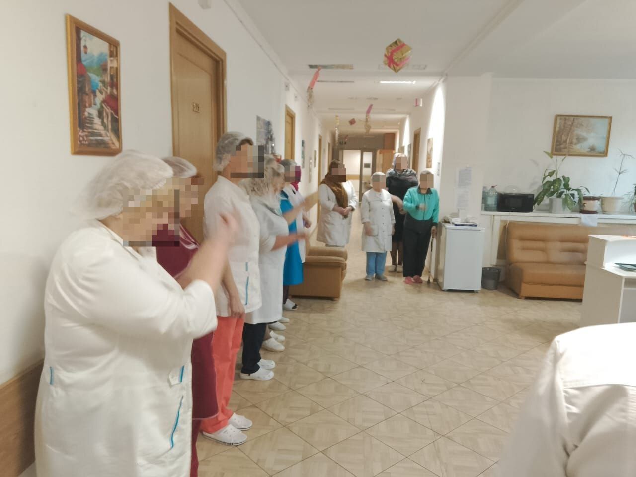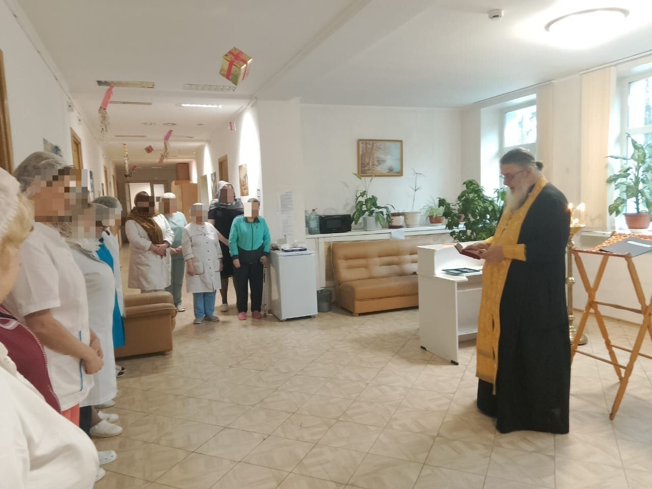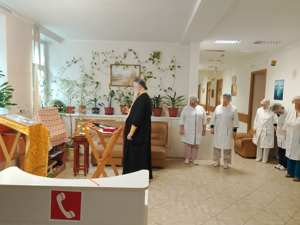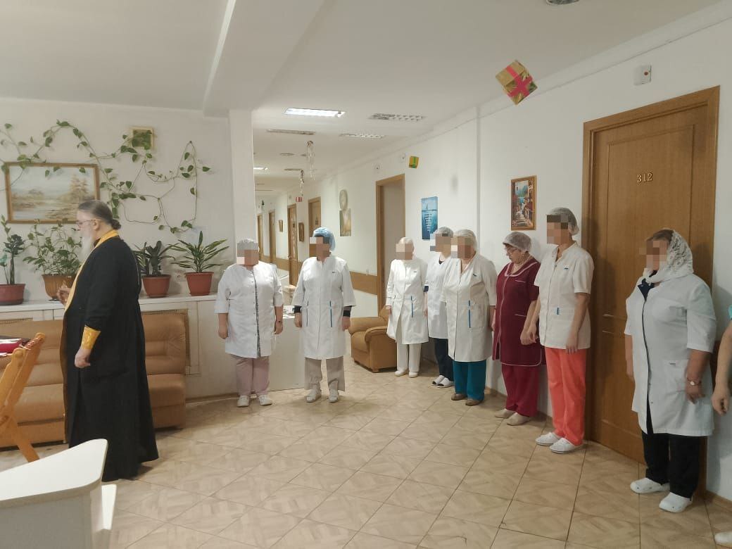 Так же отец Виктор поздравил собравшихся с днём памяти святителя Николая Чудотворца, окропил всех молящихся святой водой и пожелал персоналу, госпиталя и пациентам помощи Божией и скорого выздоровления.