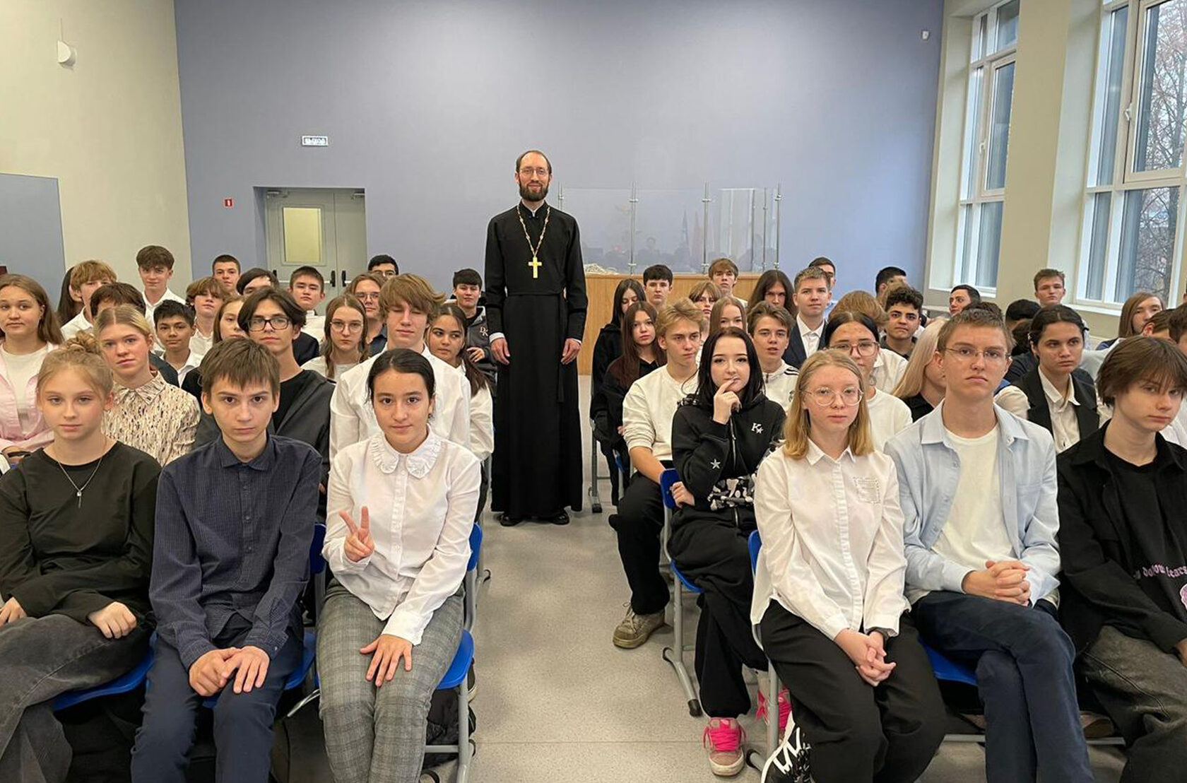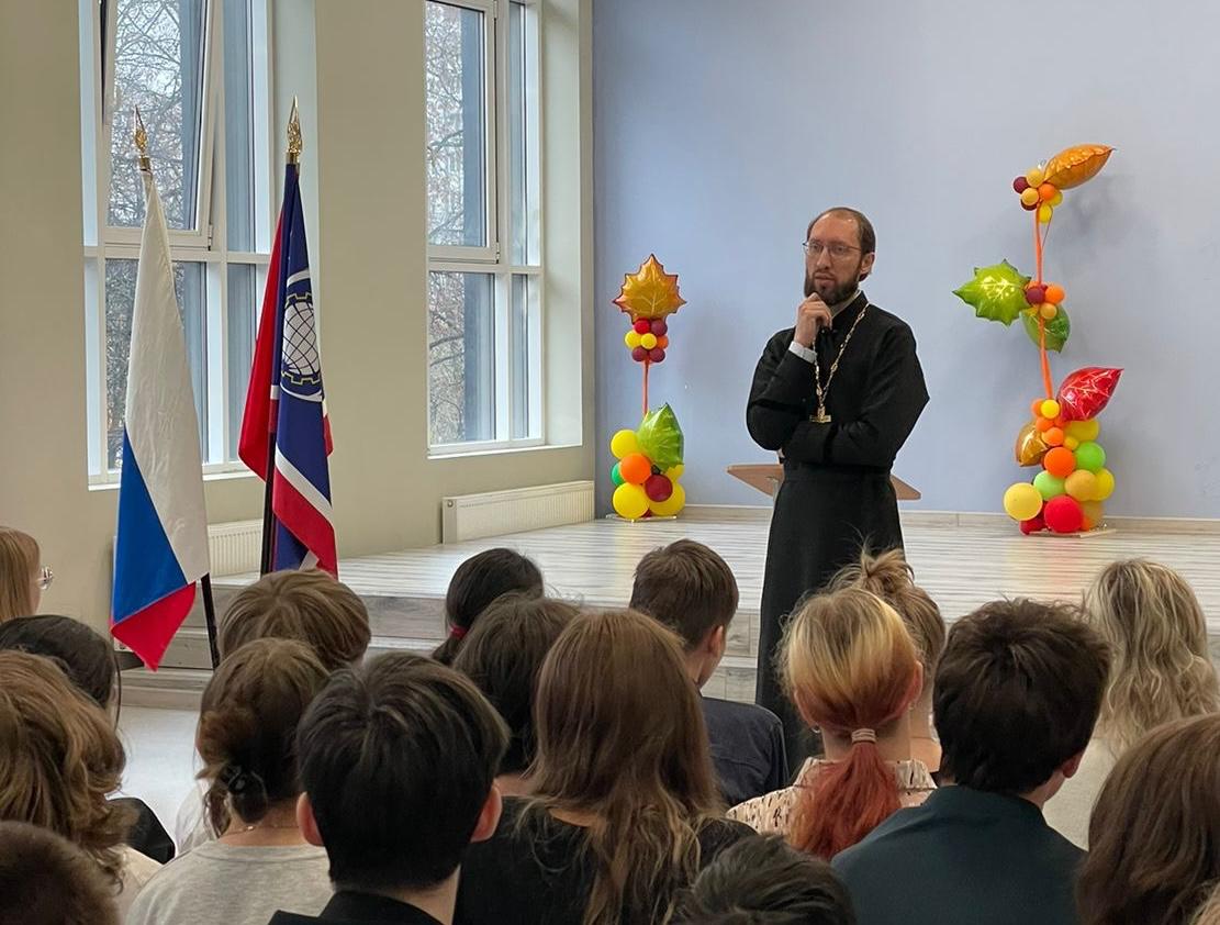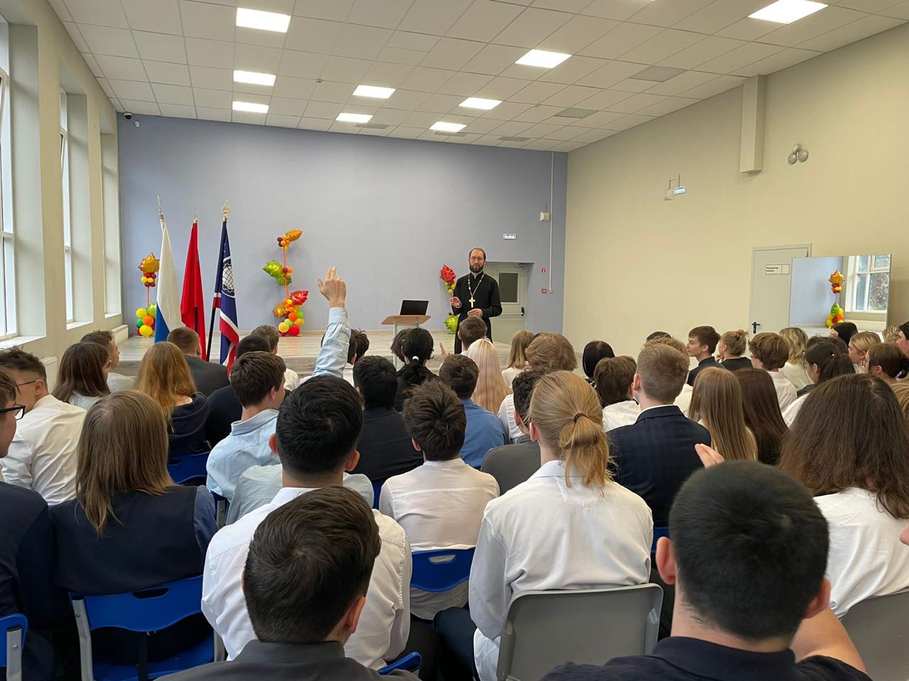 28 октября в МБОУ СОШ №10 г. Королёва состоялась встреча учеников 9-х классов с клириком Богородицерождественского храма священником Иоанном Колчиным. Мероприятие было посвящено предстоящему Дню народного единства.