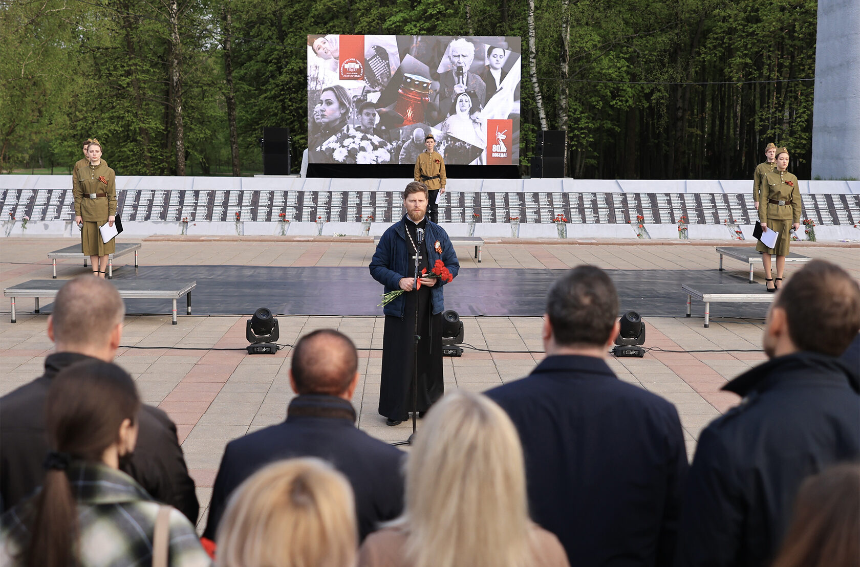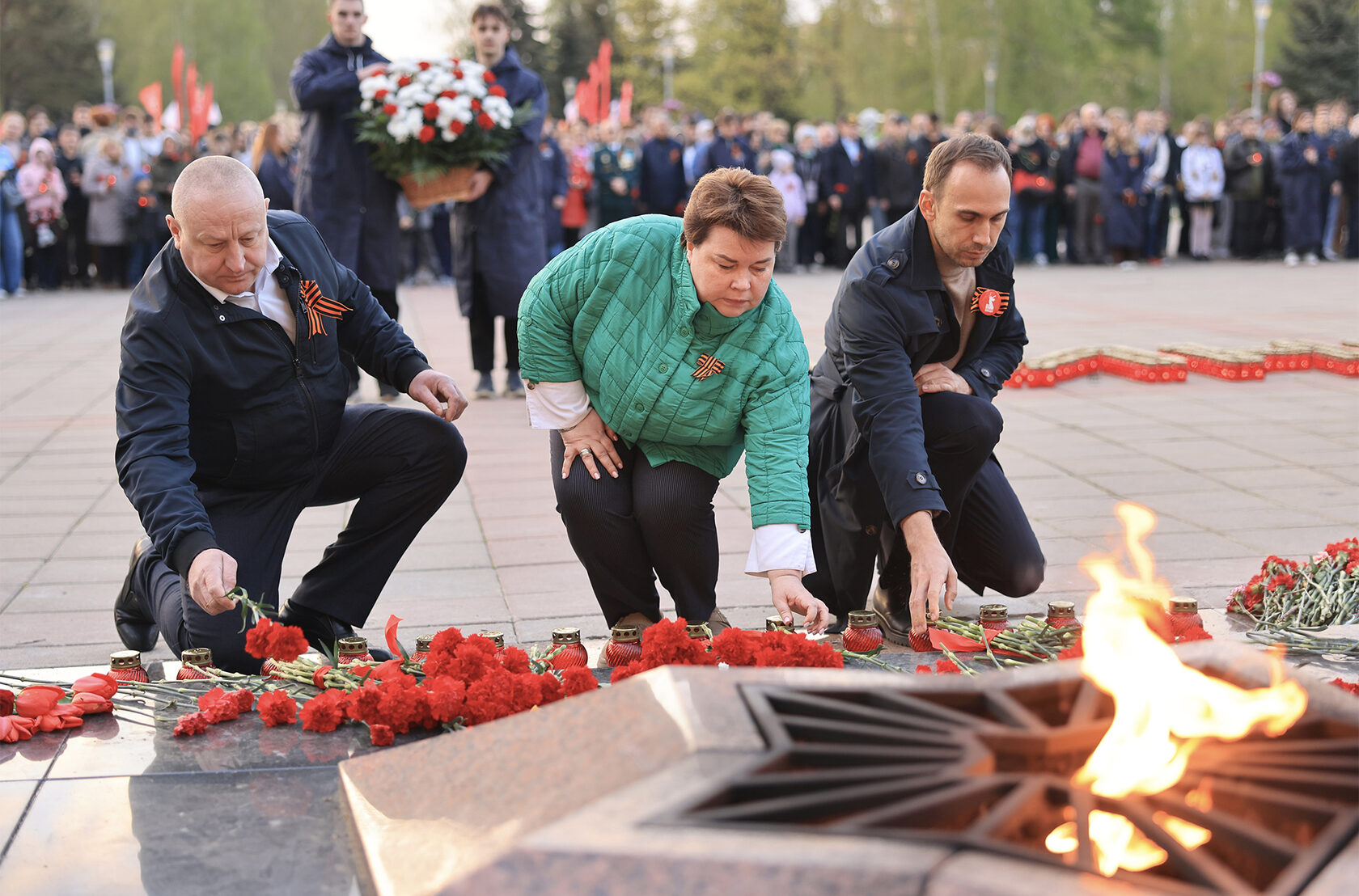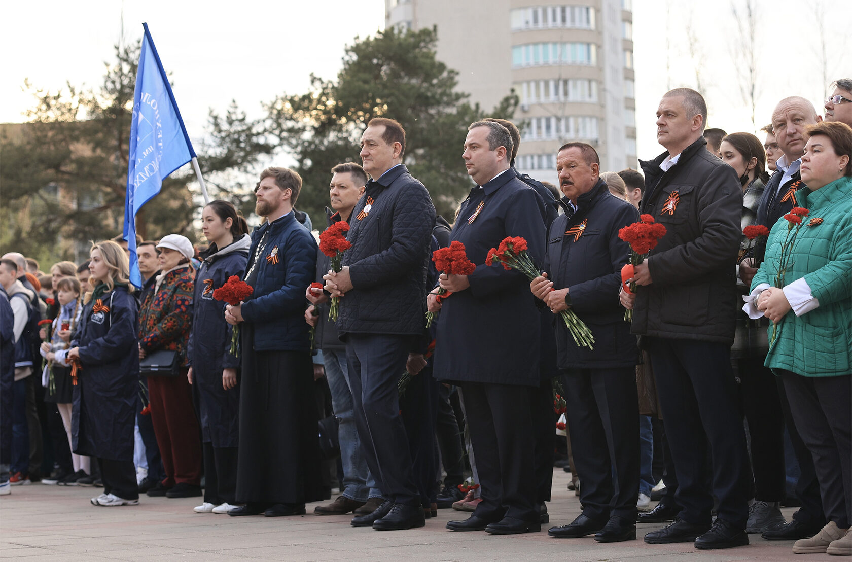 Цветы у Вечного огня возложили глава города Игорь Трифонов, Почетный гражданин Королёва, Герой России, космонавт Олег Кононенко, председатель Совета депутатов Александр Ходырев, благочинный церквей Королевского округа священник Димитрий Поповский, волонтеры, ветераны и жители наукограда.