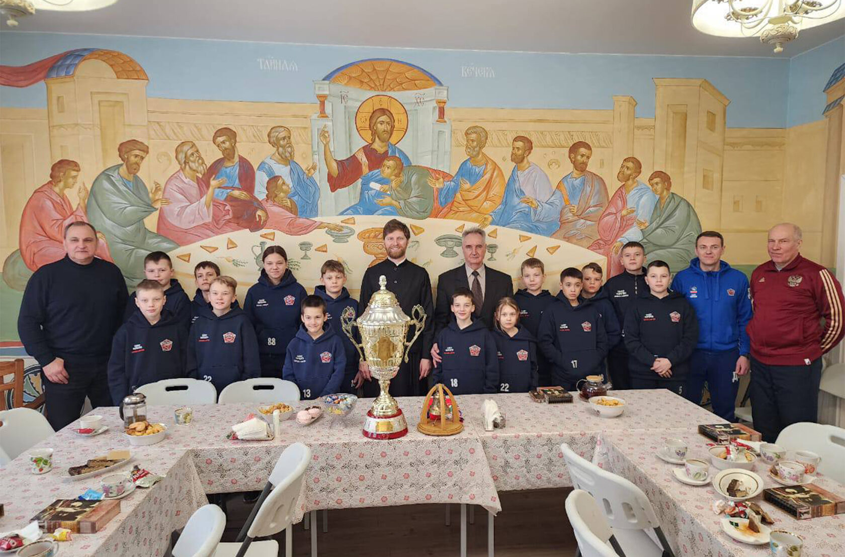 По окончании молебна все переместились в трапезную, где за кружкой чая продолжили общение. В храм ребята привезли и завоеванный второй год подряд трофей - Кубок Святейшего Патриарха по хоккею с мячом.