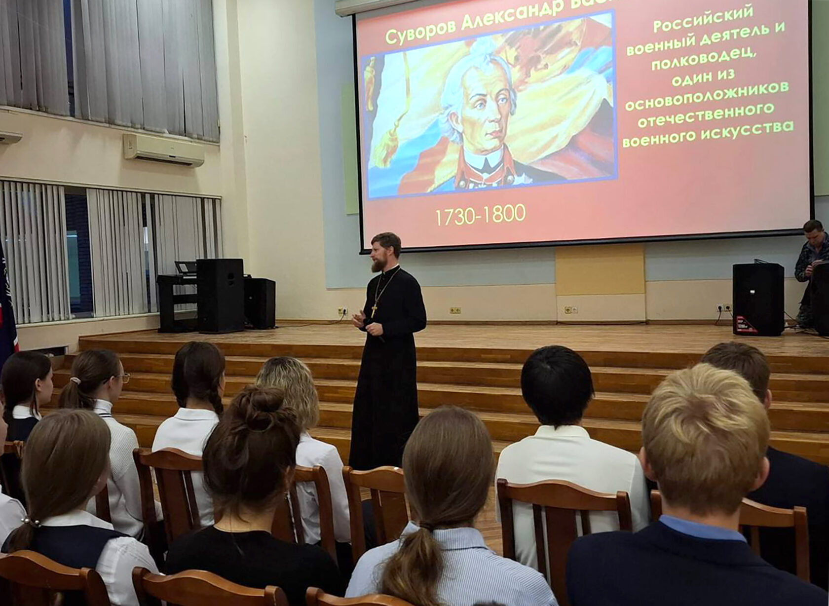 Темой для диалога стала личность великого русского полководца, не проигравшего ни одного сражения. Благочинный рассказал старшеклассникам о Суворове не только как о военном гении, но и как о глубоко верующем человеке, чья жизнь была проникнута идеалами православия, жертвенного служения Отечеству и заботы о солдатах.