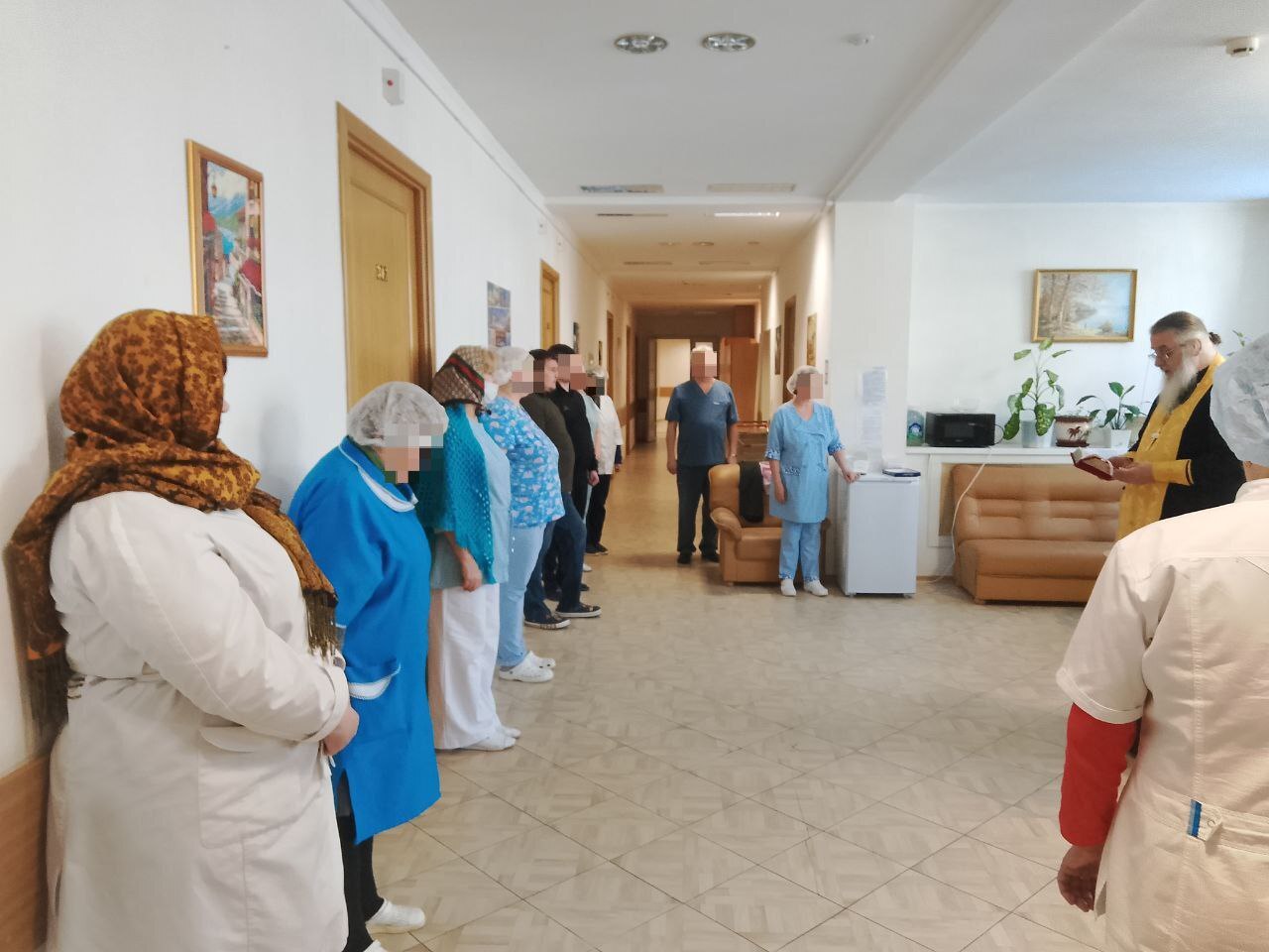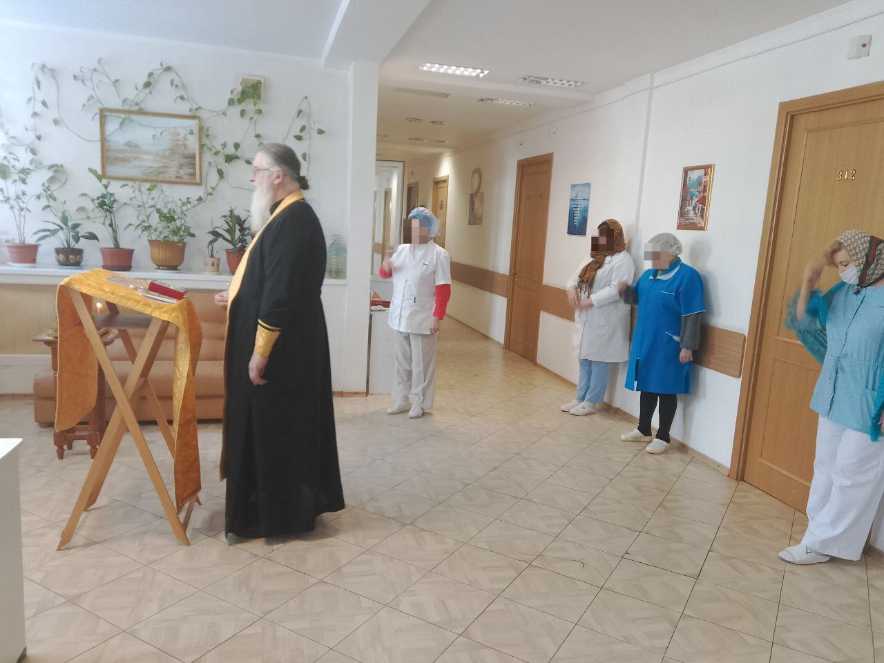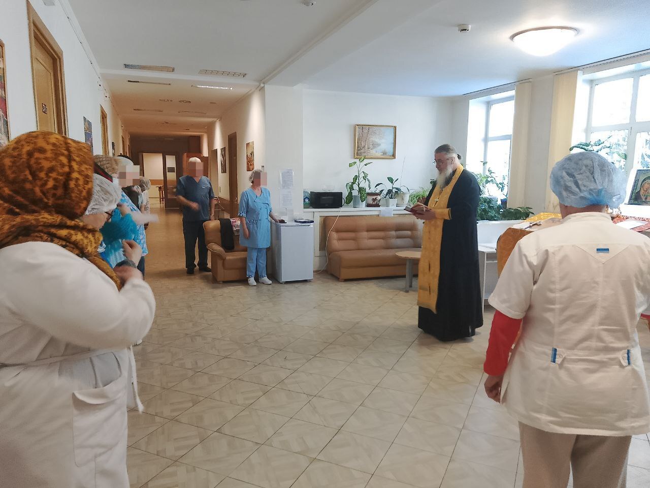 В учреждении отец Виктор отслужил молебен о здравии болящих и литию об упокоении усопших. Он окропил всех собравшихся святой водой, после чего обратился к пациентам и персоналу госпиталя с пастырским словом, пожелав им помощи Божией, душевных сил и скорейшего выздоровления.