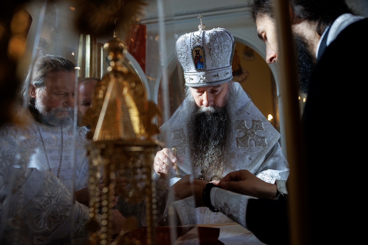 После этого владыка поздравил молящихся с торжественным событием, подарил новоосвящённому храму набор богослужебных покровцов и обратился со словами напутствия. Затем епископ Кирилл вручил епархиальные награды.