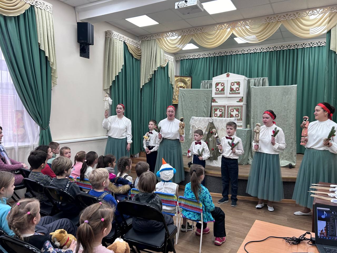 После экскурсии по храму все наши маленькие гости с учителями и родителями были приглашены в Воскресную школу на « Вертепное действие „ Царь Ирод», подготовленное преподавателями и воспитанниками Воскресной школы.