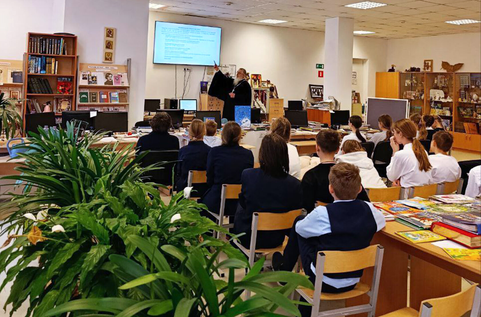 19 февраля в МАОУ «Лицей №19» состоялась встреча учащихся 6 «А» и 8 «А» классов с настоятелем Космо-Дамианского храма протоиереем Виктором Нестеровым. Мероприятие, приуроченное ко Дню защитника Отечества, прошло в библиотеке лицея в формате урока мужества.